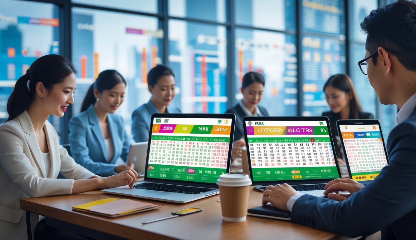 Orang-orang di kantor modern menggunakan laptop dan ponsel untuk bermain togel dengan latar belakang layar digital dan pemandangan kota Hong Kong.